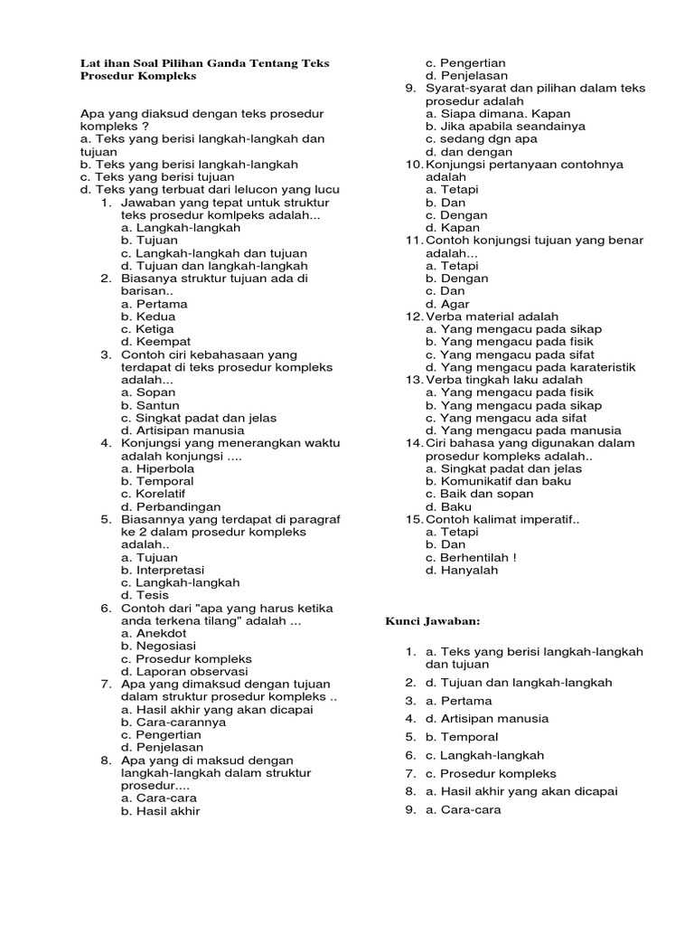 Contoh soal pilihan ganda | contoh soal dan materi pelajaran 3 kumpulan soal bahasa indonesia kelas viii contoh soal teks prosedur kompleks pilihan ganda dan jawabannya … Contoh soal teks ulasan pilihan ganda beserta jawabannya demikianlah artikel tentang 50 contoh soal pilihan ganda tentang teks prosedur kompleks beserta jawabannya kelas 7 11 12. Akan tetapi sebelum ke contoh teks prosedur berikut adalah pengertian teks prosedur. Ladies and gentlemen in case of emergency take the life jacket which is located under your seat. Pada kesempatan kali ini kakak ingin membagikan kumpulan soal soal pilihan ganda bahasa indonesia tentang teks prosedur kelas 71112 dan kunci jawabannya. Ladies and gentlemen, in case of emergency, take the life jacket which is located under your seat. Do not inflate the jacket until you left the aircraft. May 19, 2019 · soal pilihan ganda bahasa indonesia teks prosedur kompleks beserta jawabannya. Put the life jacket over your head and then fasten the jacket tapes around you're your waist. Dec 19, 2019 · soal 2 : Akan tetapi sebelum ke contoh teks prosedur berikut adalah pengertian teks prosedur. Contoh soal teks prosedur pilihan ganda beserta jawaban: Dikutip dari buku 'top one ulangan harian sma' terbitan bintang wahyu berikut pernyataan tentang teks prosedur kelas 11 bacalah teks prosedur di bawah ini!